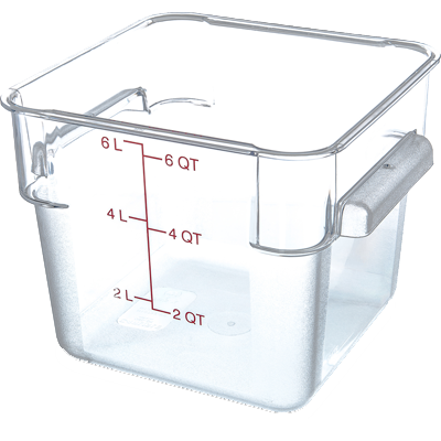 StorPlus® Food Storage Container, 6 qt., 8-3/4″ x 7-5/16″H, square, reinforced stacking lugs, secure easy-grip handles with drain holes, date indicators, color-coded capacity indicators, dishwasher safe, textured non-slip finish, polycarbonate, clear, NSF